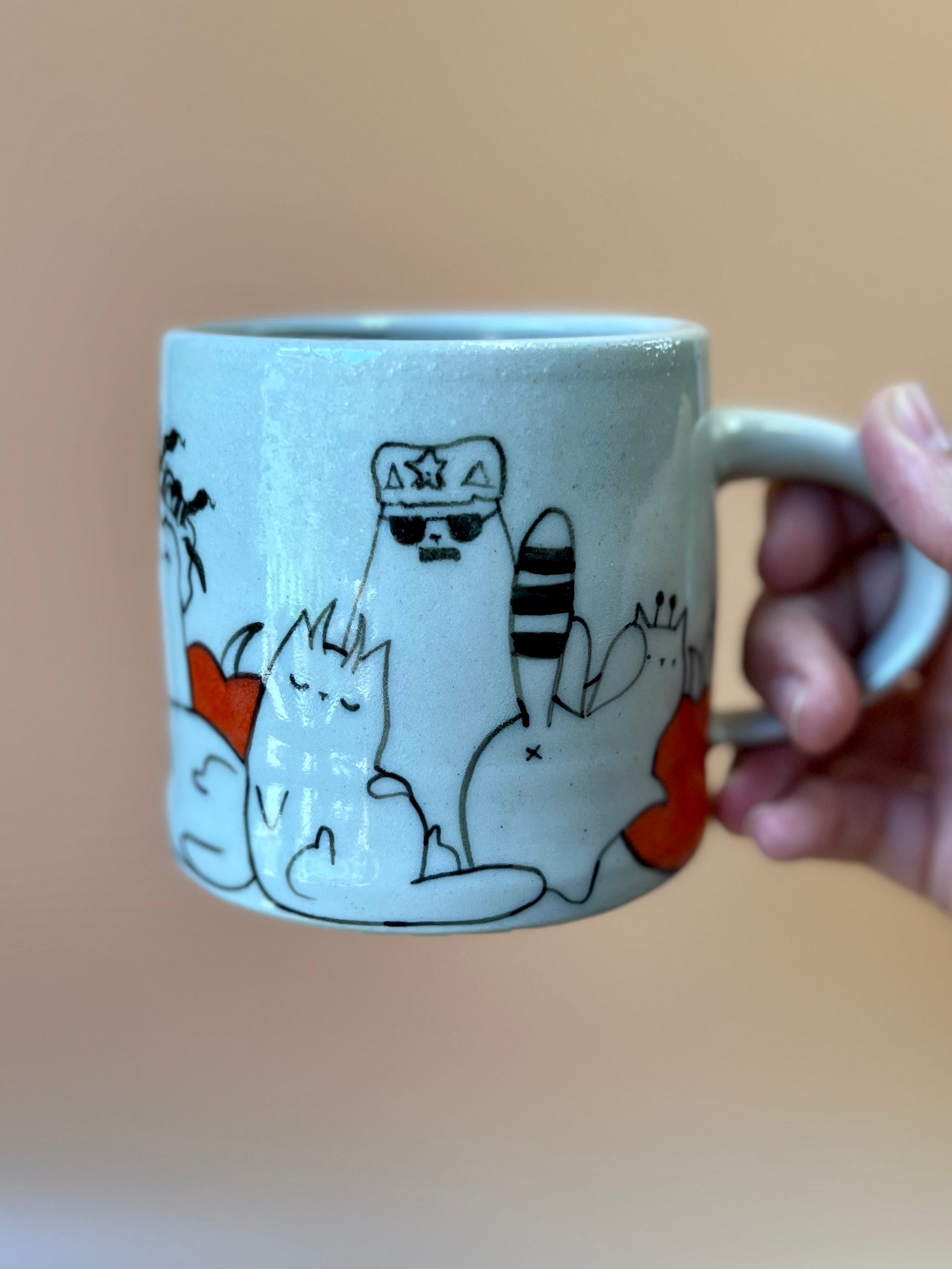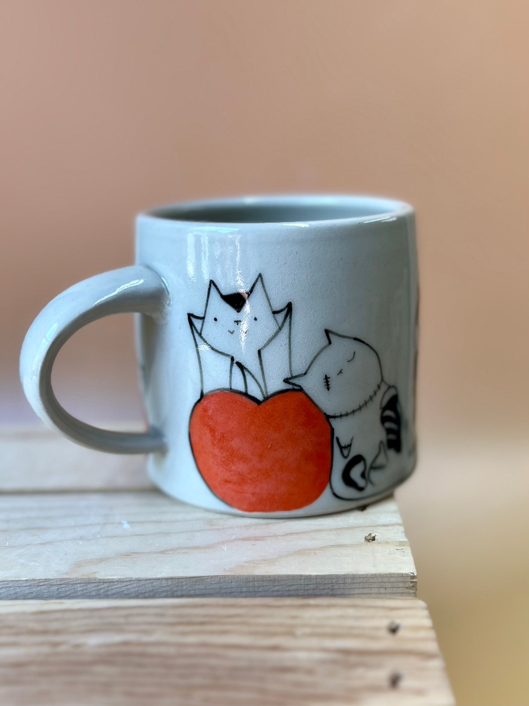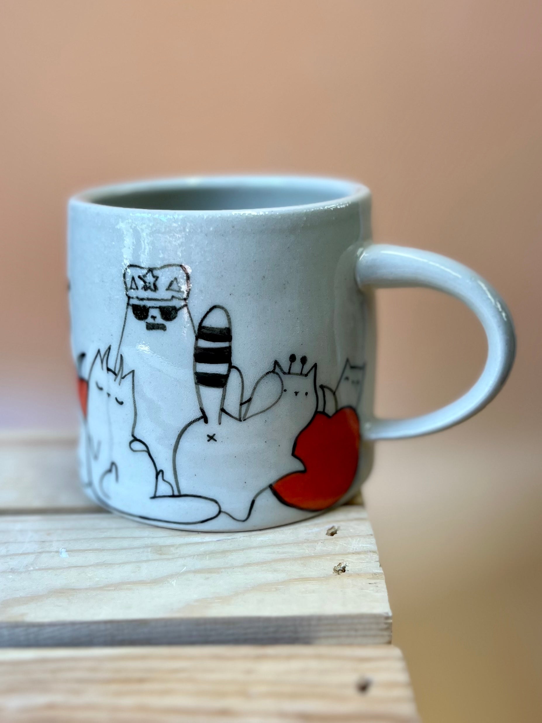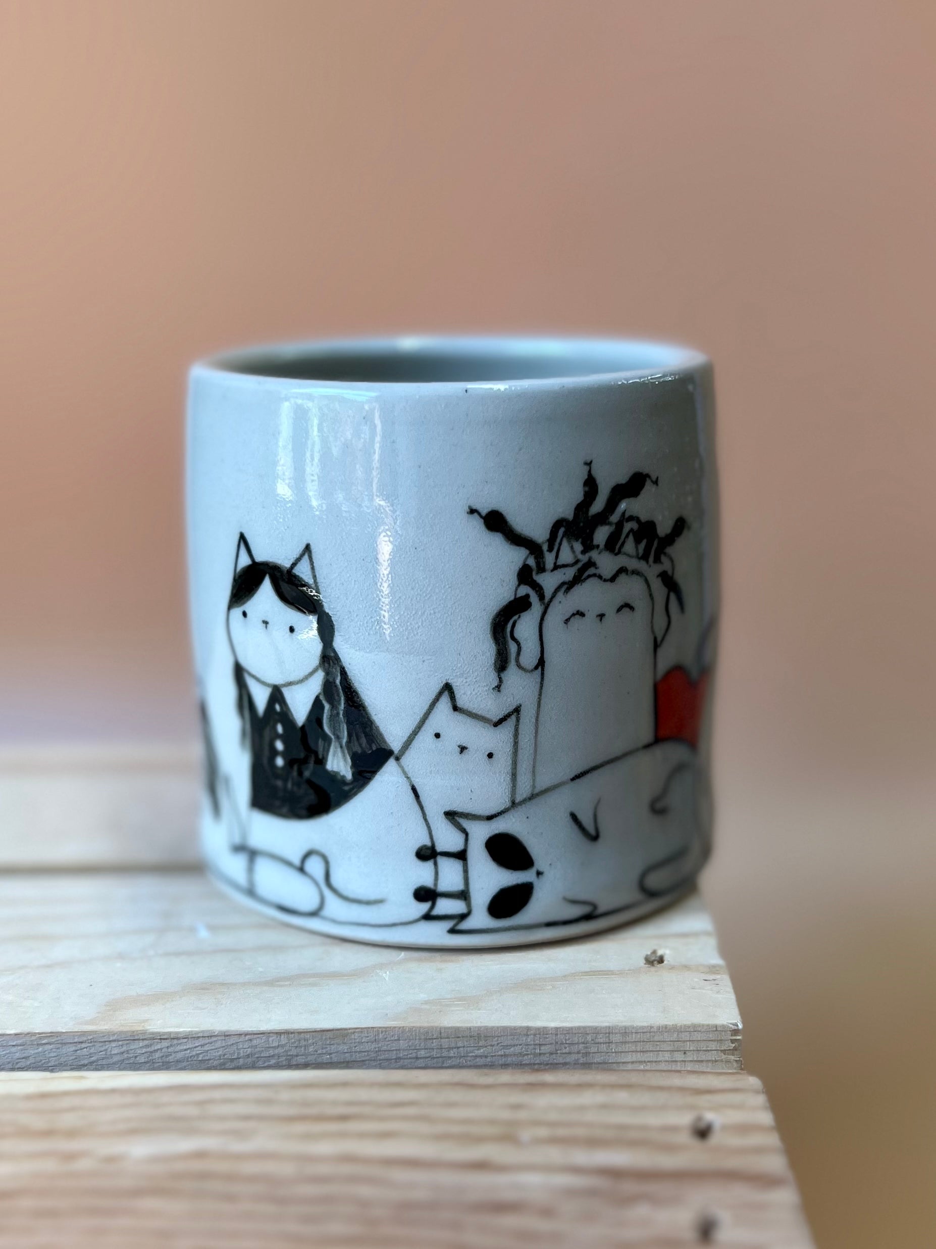 This is a 12 oz. Simple barrel shaped mug with hand painted cats wearing costumes! This mug has a vampire, zombie, Wednesday Adams, alien, Medusa, devil, cop and bumble bee.