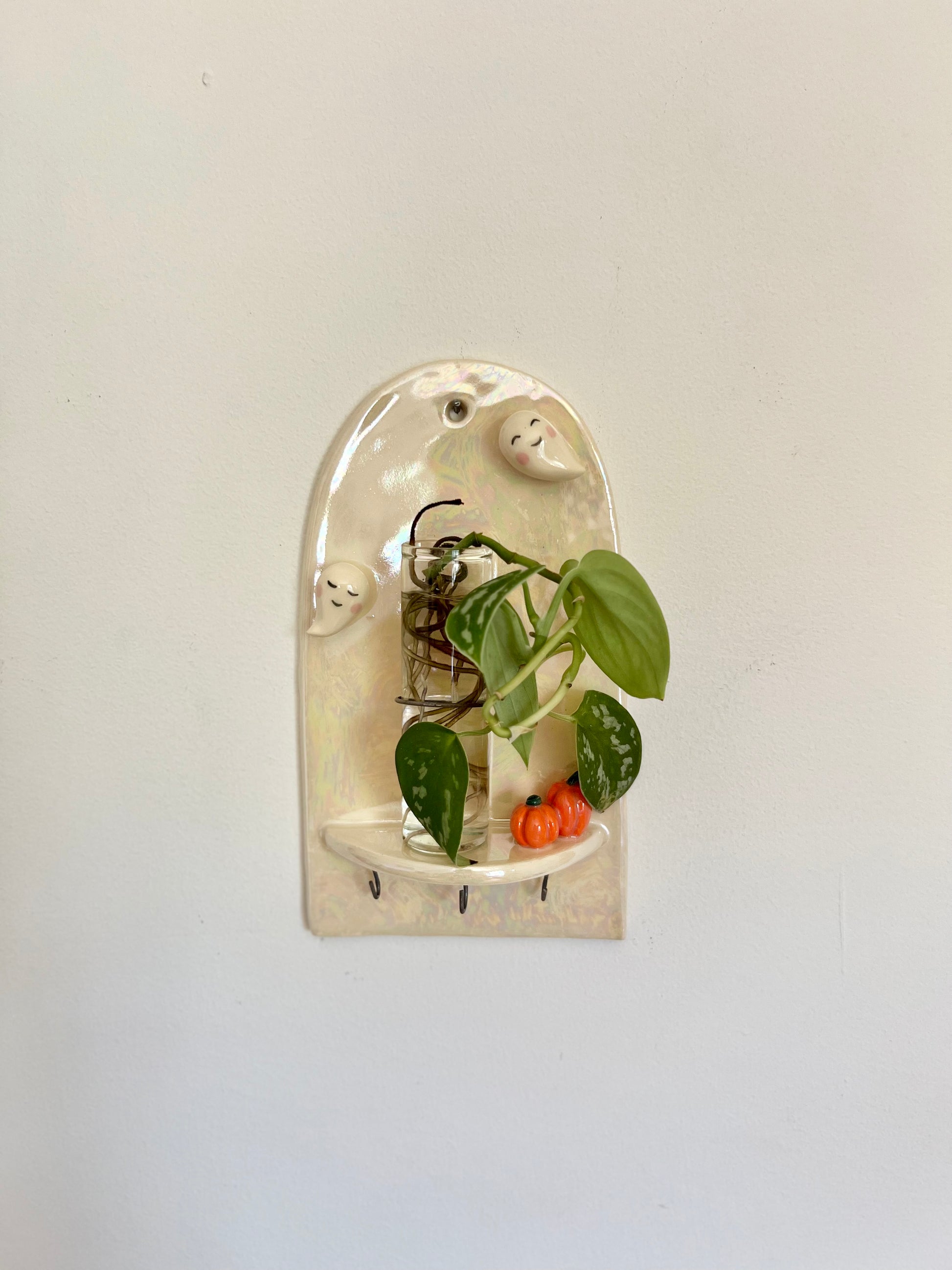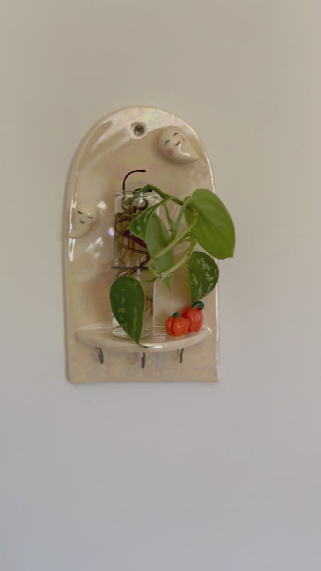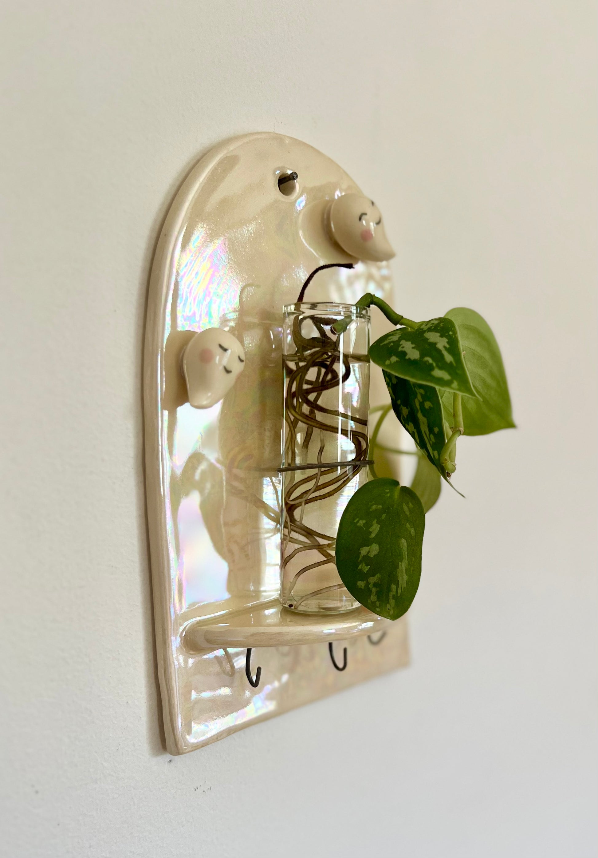 This handmade ceramic wall hanging is a work of art, showcasing intricate hand-drawn mushrooms against a striking black background. It also features a small shelf with a glass tube for propagating plants or using as a vase. The glass propagation tube is secured by a thick wire coil that has been fired directly into the clay. There are handy hooks on the bottom for organizing necklaces and other small treasures. A multifunctional piece that adds elegance and functionality to your space.