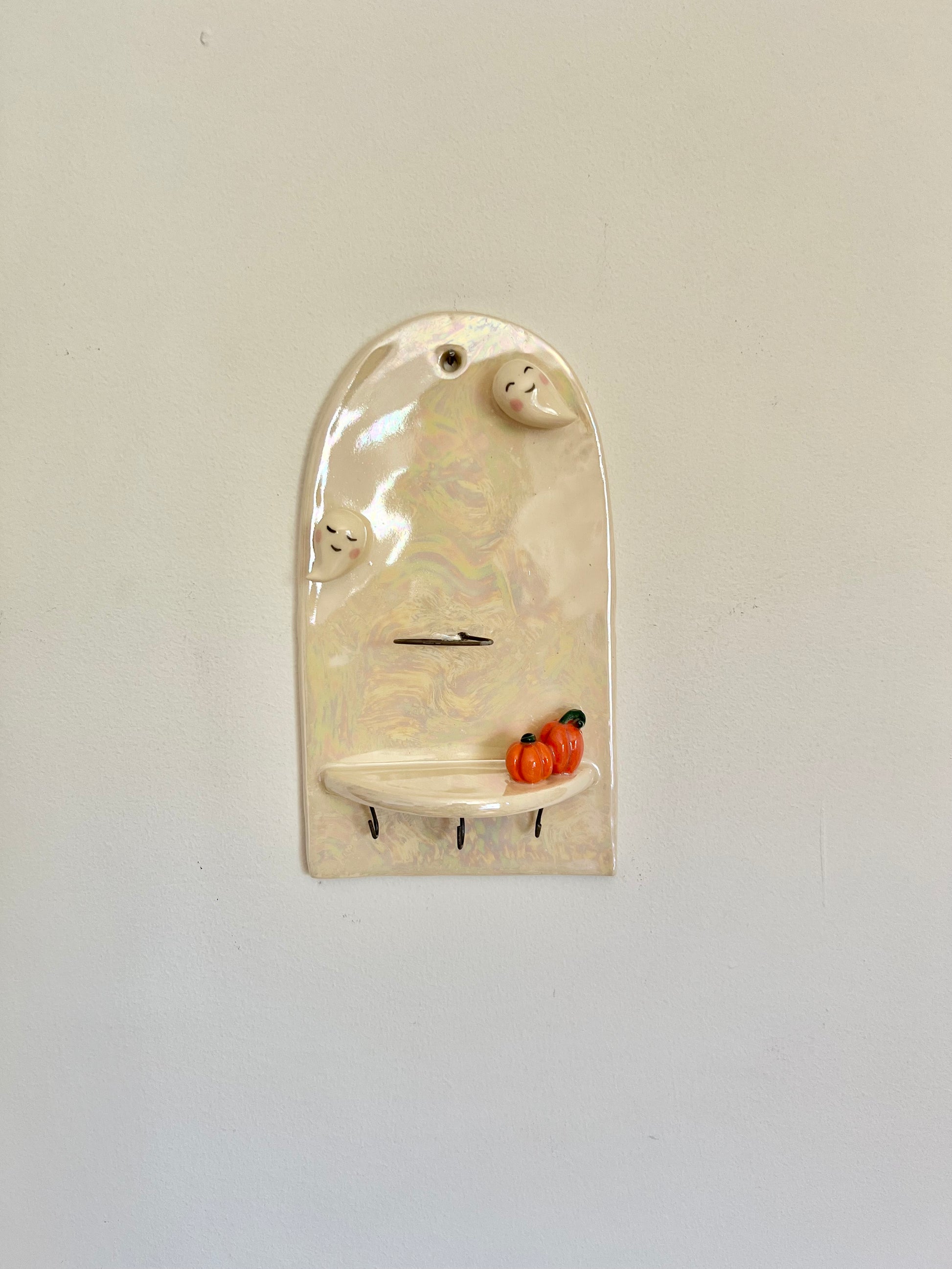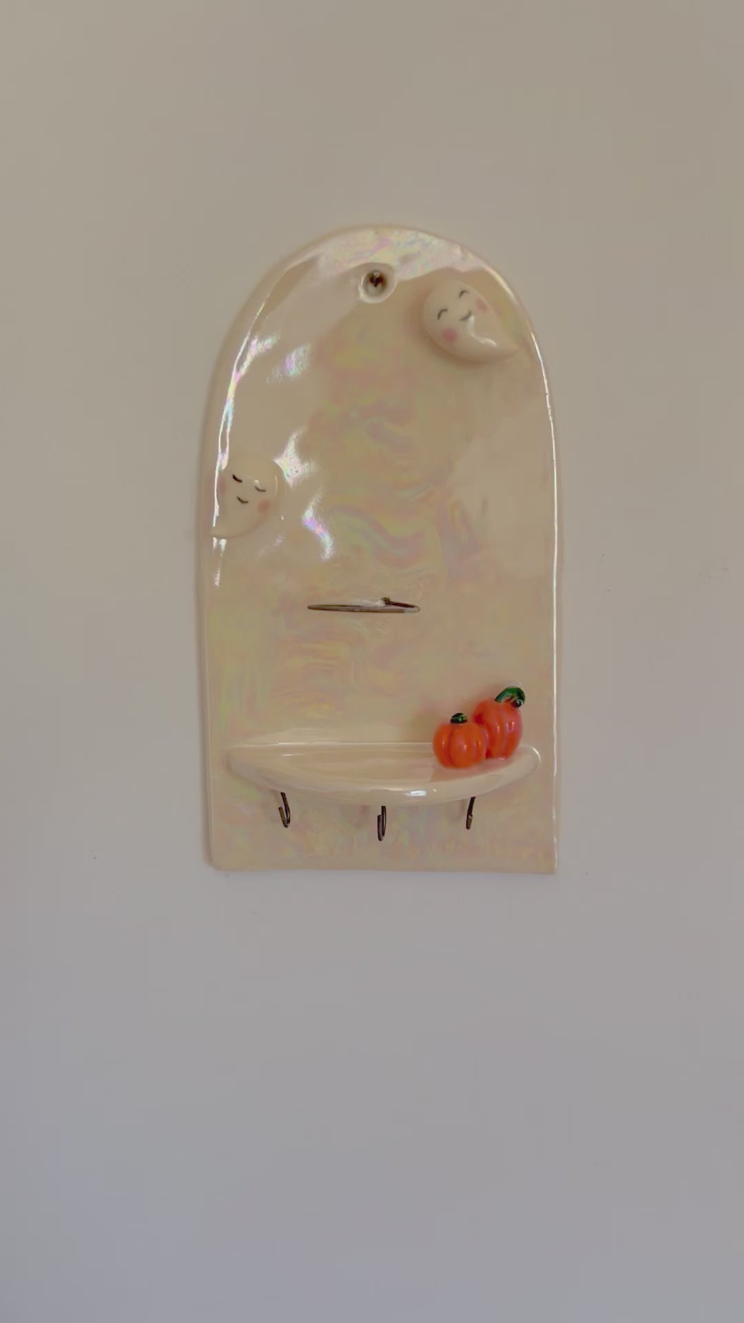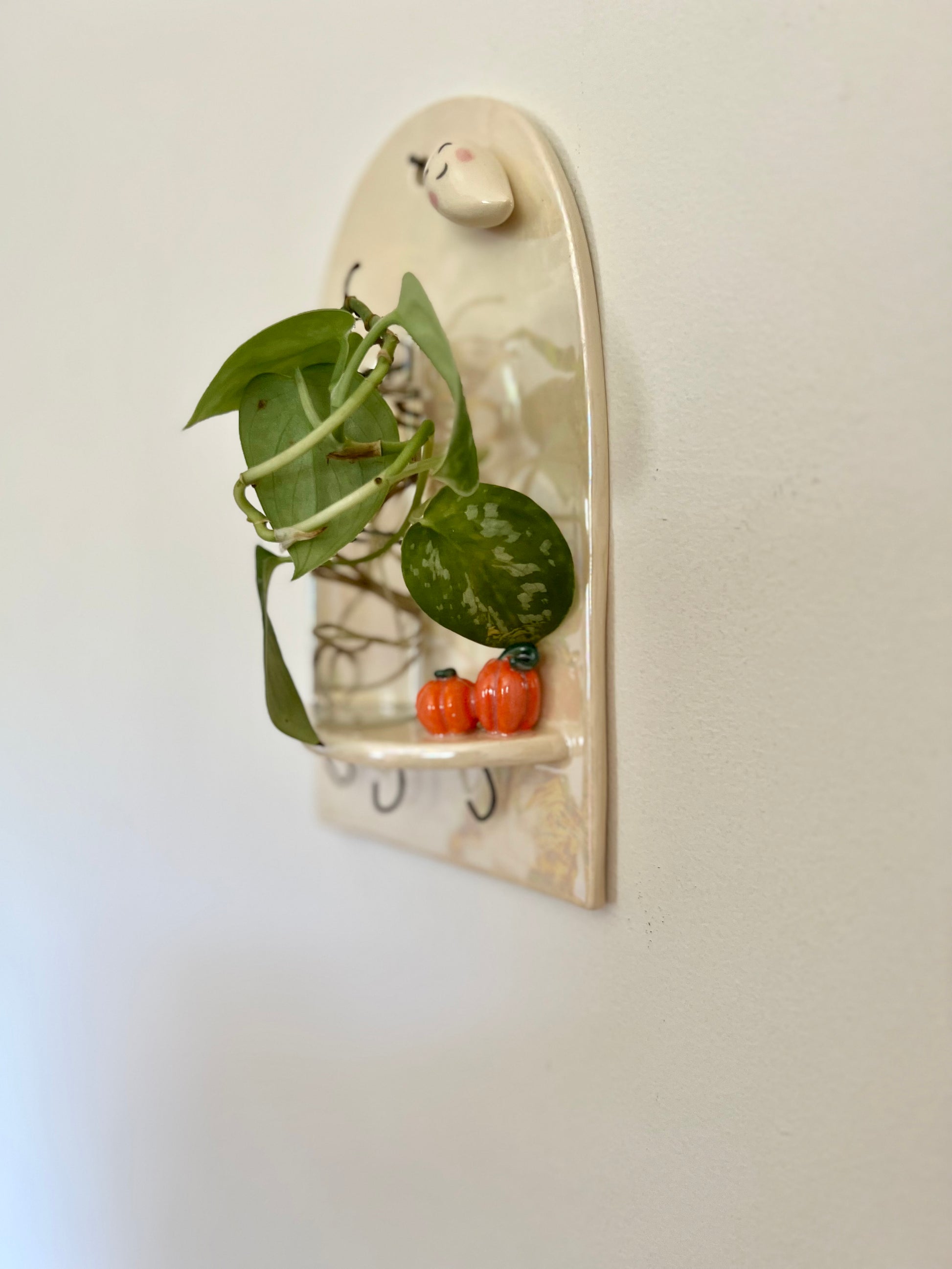 This handmade ceramic wall hanging is a work of art, showcasing intricate hand-drawn mushrooms against a striking black background. It also features a small shelf with a glass tube for propagating plants or using as a vase. The glass propagation tube is secured by a thick wire coil that has been fired directly into the clay. There are handy hooks on the bottom for organizing necklaces and other small treasures. A multifunctional piece that adds elegance and functionality to your space.