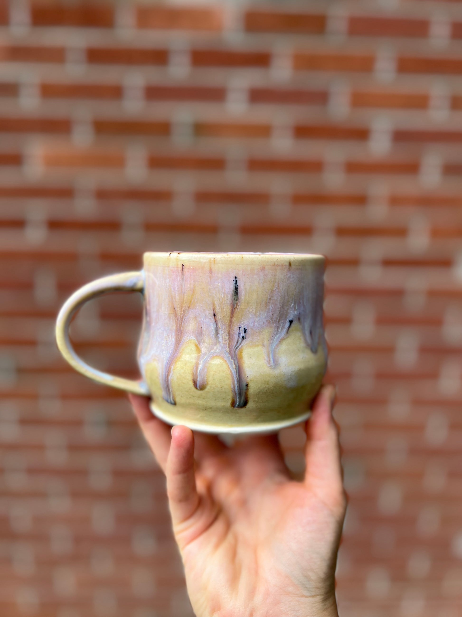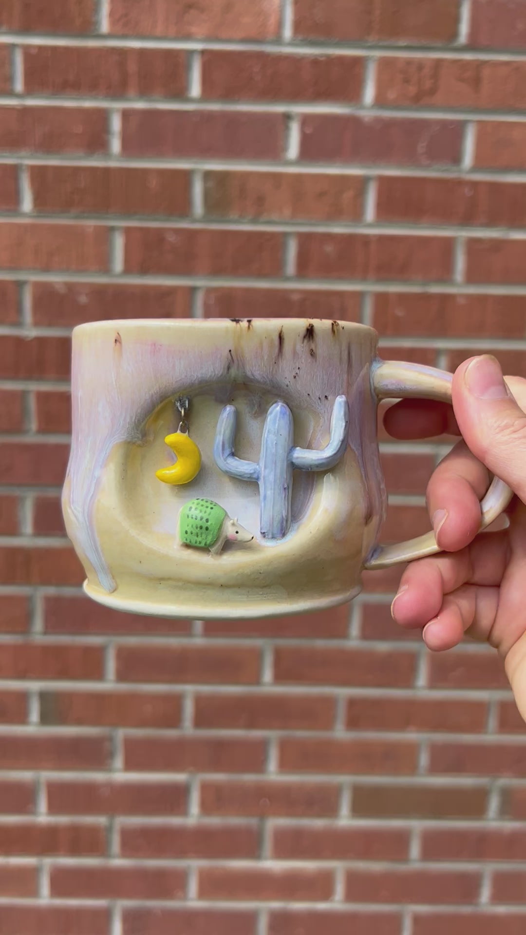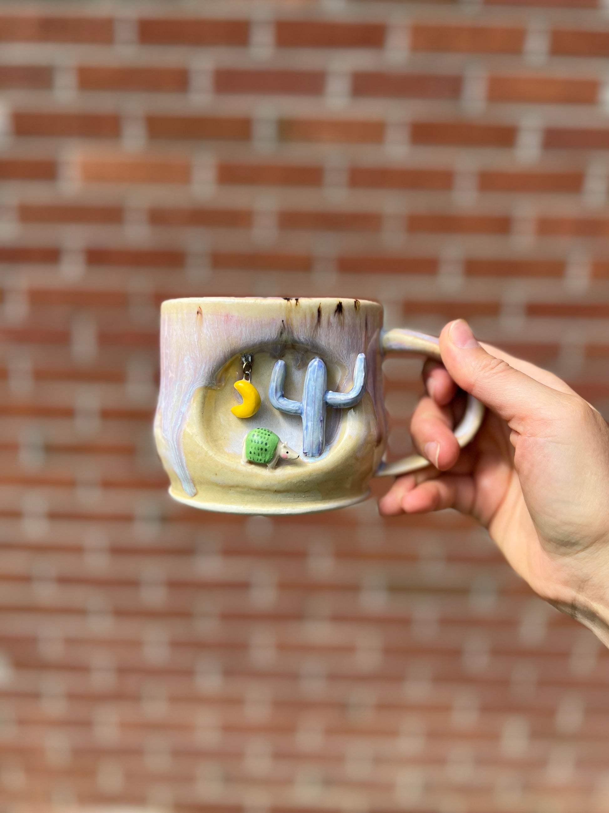 A small handmade, coffee mug featuring a tiny green armadillo and a blue cactus, with a little yellow moon dangling above them. Holds about 12 ounces.